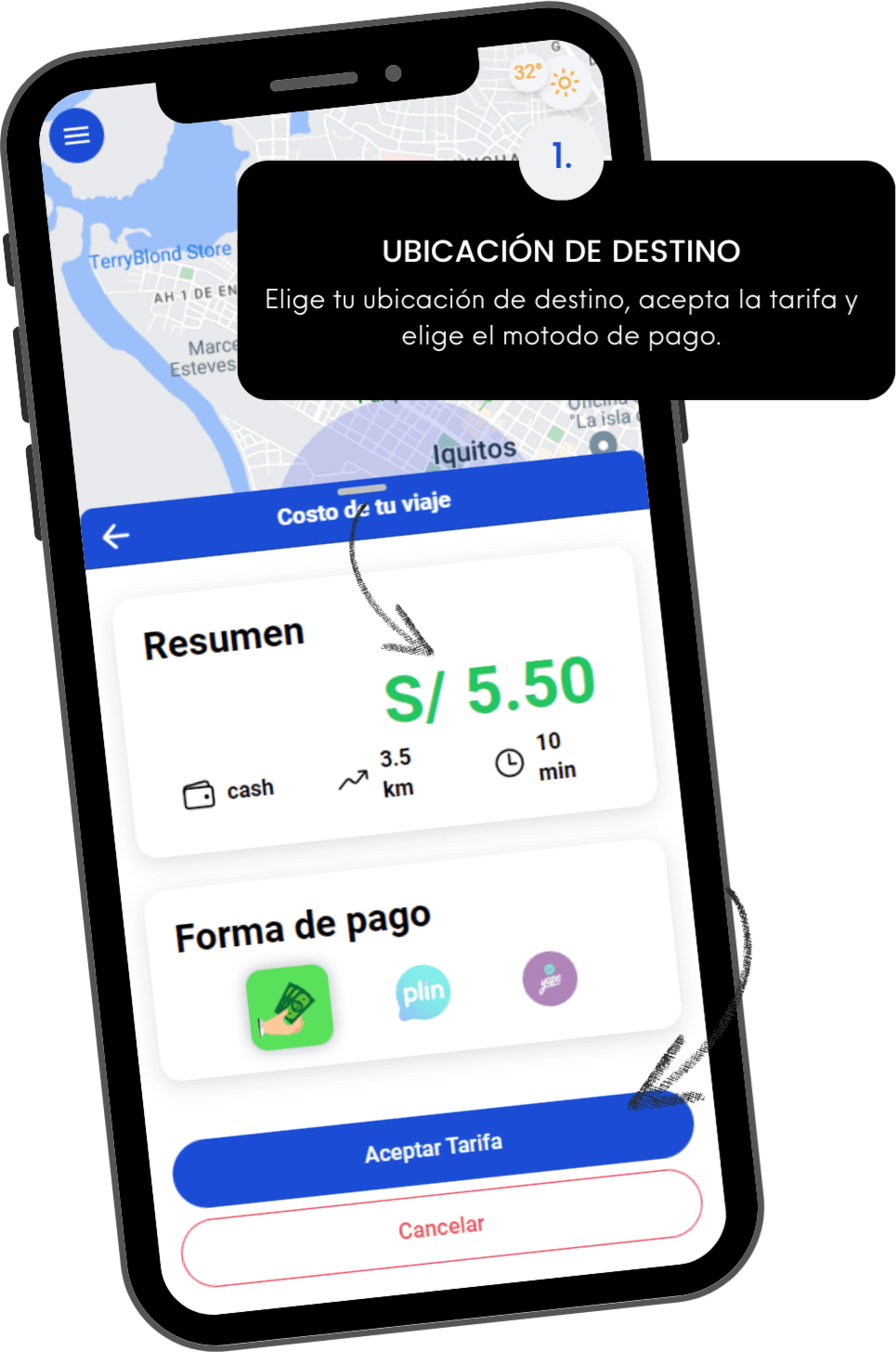 Antes de iniciar un viaje, elige tu destino, checkea el tiempo, distancia y la tarifa que se aplicará a tu viaje.